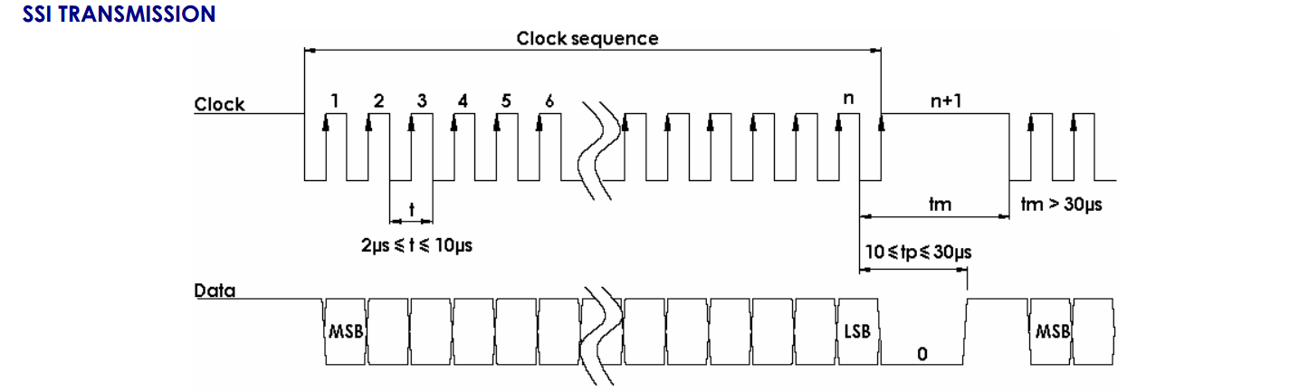 雷恩PRECILEC SSI傳輸接口多圈絕對(duì)值編碼器AMH9系列采用SSI通訊接口,響應(yīng)頻率快,它只通過(guò)二個(gè)信號(hào)“時(shí)鐘和數(shù)據(jù)”的串行方式來(lái)傳輸而與編碼器的精度無(wú)關(guān).編碼器數(shù)據(jù)同步讀取是根據(jù)SSI計(jì)數(shù)部分給出的時(shí)鐘頻率進(jìn)行的。
