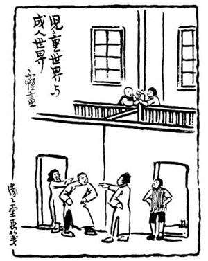 孩子們即使鬧翻了臉,甚至打起來,但沒多久就會忘記而又和好了。因為他們心地純樸、天真,不像有些大人,勾心斗角,心地狹窄,易記仇,講幫派。你看,畫中的兩家男主人吵架,各自的妻子還在后面幫腔,而自家樓上的兒女卻隔著欄桿互贈送花朵