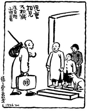 抗戰(zhàn)勝利后,由于交通困難,我家到1946年夏才從大后方回到江南。當父親第1次還鄉(xiāng)探望故里—浙江石門灣時,那里已成一片廢墟,不可復(fù)識。鄉(xiāng)親們看見父親一行人操著道地的石門灣土白邊走邊談時,覺得十分驚奇:這小鎮(zhèn)上怎么來了一群陌生人,說話卻全是本地口音!后來,父親聽見背后有人竊竊私語:“豐子愷!”“豐子愷回來了!”但父親一路走著,卻不見一個認識的人,因為這些人抗戰(zhàn)前都是孩子或少年,現(xiàn)在都已變成了成人。父親若想要認識他們,只有問他的父親叫什么。父親說,“兒童相見不相識,笑問客從何處來”這兩句詩,從前是談?wù)劧?,想不到如今自己做了詩中的主?